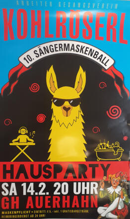 Programm 2026: Zum 10. Mal findet der Sängermaskenball des Arbeiter Gesangs Vereines KOHLRÖSERL beim Gasthof Auerhahn statt.