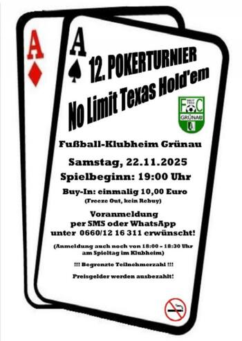 12. Pokerturnier No Limit Texas Hold´em am Samstag, 22. November 2025 im Fußball-Klubheim in Grünau.