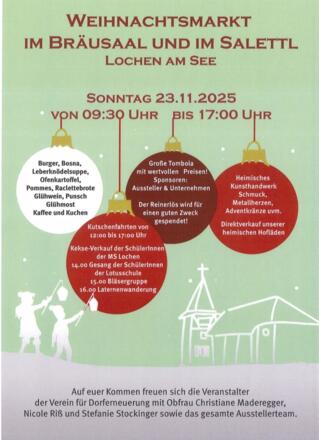 Am Sonntag, den 23. November 2025, lädt die Dorferneuerung herzlich zum stimmungsvollen Weihnachtsmarkt in den Bräusaal Lochen am See ein. Von 8:30 bis 17:00 Uhr erwartet die Besucherinnen und Besucher ein vielfältiges Angebot rund um Genuss, Handwerk und Tradition.