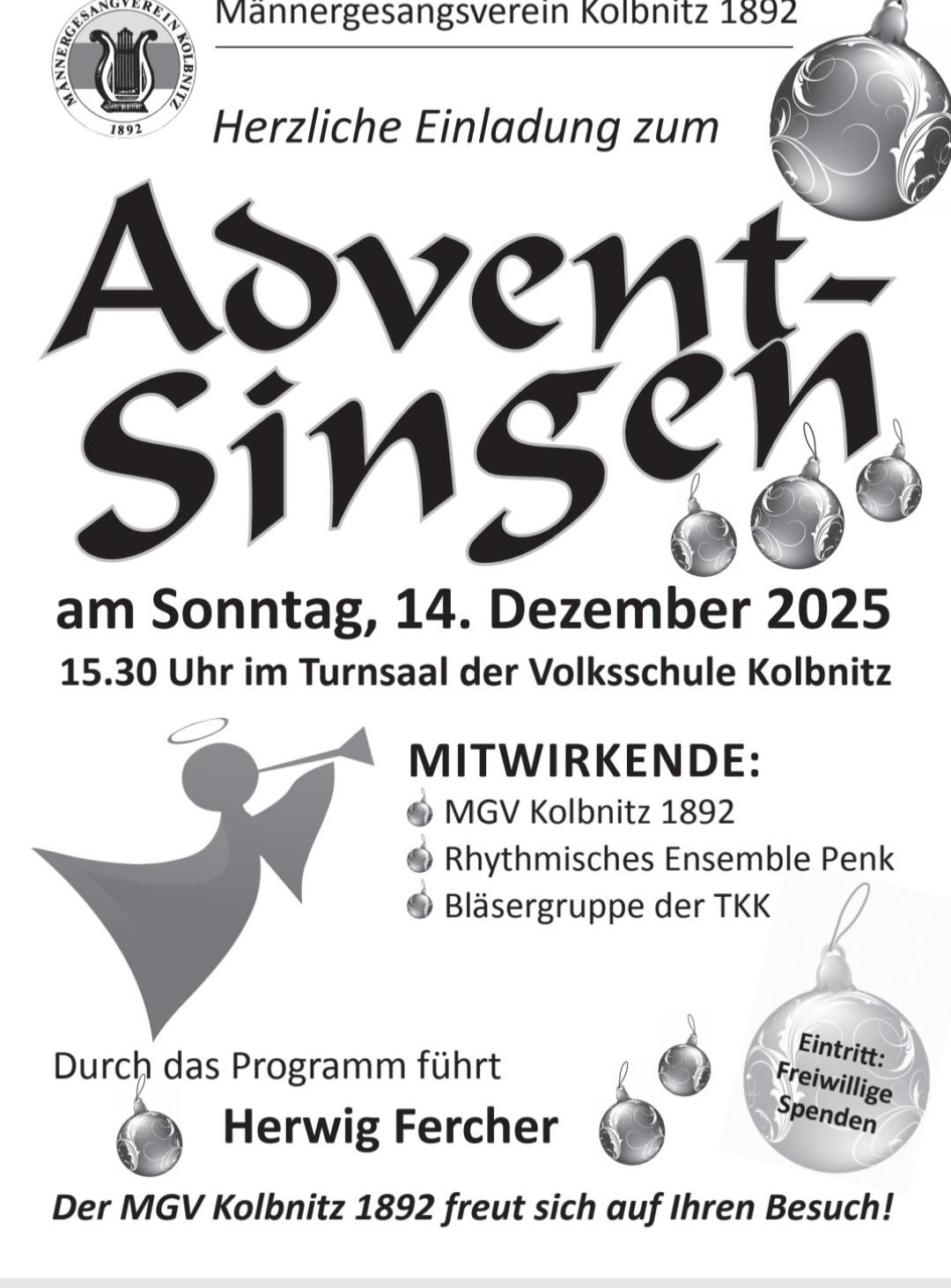 Herzliche Einladung zum Advent-Singen des MGV Kolbnitz unter Mitwirkung des Rhythmischen Ensemble Penk und der Bläsergruppe der Trachtenkapelle Kolbnitz.