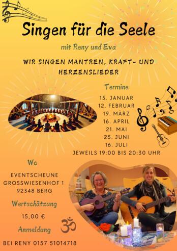 Wir singen Mantren, Kraft- und Herzenslieder aus aller Welt. Frei und ohne Noten. Es sind keinerlei Vorkenntnisse nötig, nur Spaß und Freude am Singen. Begleitet von verschiedenen Instrumenten wie Gitarre, Ukulele, Indisches Harmonium, Altflöte, uvm. Reny und Eva sorgen für eine angenehme Atmosphäre und leiten durch den Abend.