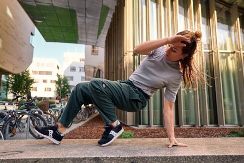 Pia macht mit euch Breaking Schritte und erarbeitet akrobatische Moves und Selina erstellt Hip Hop Choreographien mit euch.
