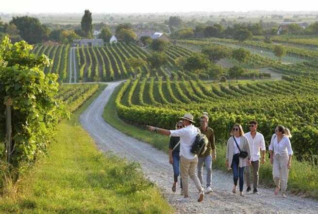 Unsere WinzerInnen fü̈hren Sie durch die Top-Rieden und berichten Wissenswertes über ihre Arbeit und wie Hand in Hand mit der Natur ausgezeichnete Weine entstehen. Bei klarem Himmel genießen Sie eine traumhafte Aussicht über den Neusiedler See bis hin zum Schneeberg.