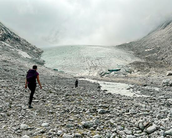 Auf ca. 2.100 m erreichen wir eine Ebene, die vor drei Jahrzehnten noch von Gletschern bedeckt war. Die Vegetation kämpft sich hier immer weiter voran. Gletscherhahnenfuß und Polsterpflanzen wie das stängellose Leimkraut können wir hier finden. Über eine kleine Felsstufe gelangen wir bis zum Rand des Untersulzbachkees. Der Boden unter uns war Jahrhunderte lang von Gletschereis bedeckt. Die Auswirkungen der Klimaerwärmung sind hier eindrucksvoll zu sehen.