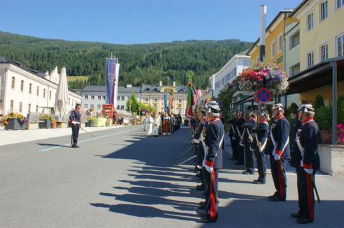 Nach dem Dankgottesdienst wird beim Kriegerdenkmal Aufstellung genommen. Mit einem Choral der Musikkapelle und einem Gebet von Pfarrer Roman Eder wird die Gedenkfeier eröffnet.