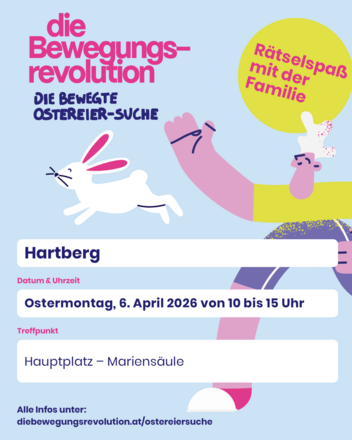 Am Ostermontag, den 6.April 2026, laden wir zur Bewegten Ostereier-Suche! Von 9 bis 15 Uhr gehen kleine und große Entdecker:innen in sechs steirischen Gemeinden auf die Jagd nach zehn geheimnisvollen Ostereiern. Wer alle zehn Verstecke findet und noch dazu das Rätsel lüftet, hat nicht nur Riesen-Spaß, sondern verdient sich eine kleine Belohnung.