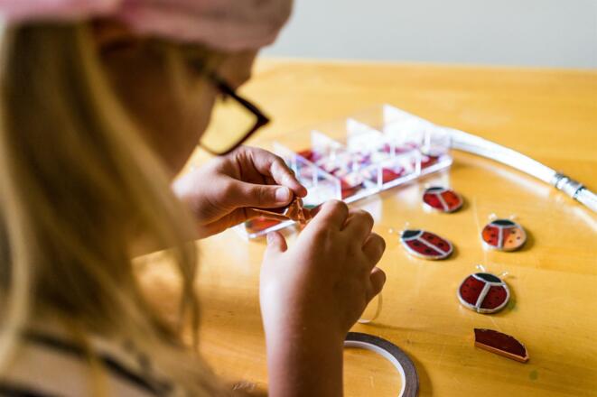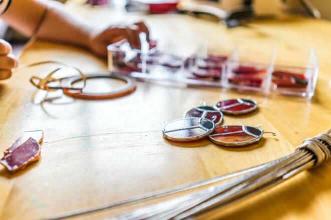 Bunte Glasteile werden zuerst behutsam geschliffen und in die gewünschte Form gebracht. Durch Löten werden die Glassplitter miteinander verbunden und ein kleines Glaskunstwerk entsteht.
