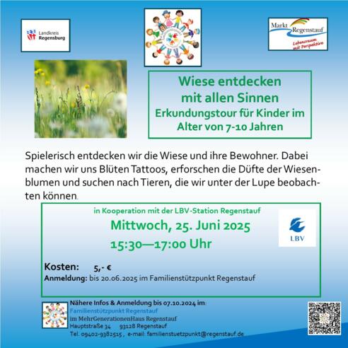 Spielerisch entdecken wir die Wiese und ihre Bewohner. Dabei machen wir uns Blüten Tattoos, erforschen die Düfte der Wiesenblumen und suchen nach Tieren, die wir unter der Lupe beobachten können.In Kooperation mit der LBV-Station RegenstaufKosten: 5,- € pro KindAnmeldung bis 18.06.2025 im Familienstützpunkt RegenstaufTel.: 09402 9382515 , e-mail: familienstuetzpunkt@regenstauf.de