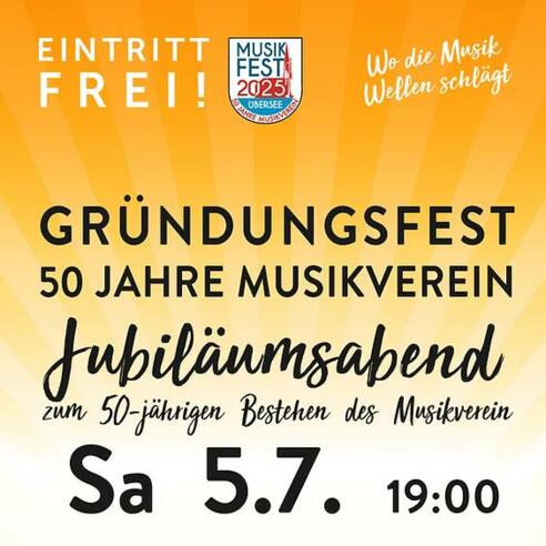 Am Samstag, 5. Juli 2025 findet der Jubiläumsabend 50 Jahre Musikverein Übersee-Feldwies statt. Die Blaskapelle Übersee-Feldwies spielt zur Unterhaltung auf. Es wird Ansprachen und Ehrungen der altgedienten Musikanten geben. Weitere Bühnenprogrammpunkte tragen zur Auflockerung bei. Höhepunkt des Abends ist die Stabübergabe des Dirigenten der Blaskapelle Übersee-Feldwies. Das Barzelt öffnet zu späterer Stunde. Der Eintritt ist frei!