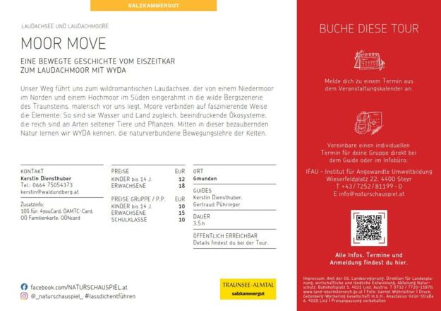 Unser Weg führt uns zum wildromantischen Laudachsee, der von einem Niedermoor im Norden und einem Hochmoor im Süden eingerahmt in die wilde Bergszenerie des Traunsteins, malerisch vor uns liegt. Moore verbinden auf faszinierende Weise die Elemente: So sind sie Wasser und Land zugleich, beeindruckende Ökosysteme, die reich sind an Arten seltener Tiere und Pflanzen. Mitten in dieser bezaubernden Natur lernen wir WYDA kennen, die naturverbundene Bewegungslehre der Kelten.
