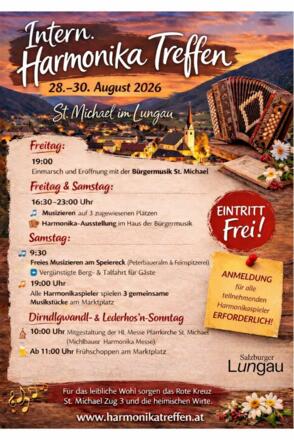 Unter dem Motto "Gemeinsames Musizieren - G`sungen und G`spielt“ wird St. Michael vom 28. bis 30. August 2026 zum pulsierenden Zentrum der Harmonika-Musik. Drei Tage voller mitreißender Klänge, schwungvoller Melodien und unvergesslicher Erlebnisse erwarten euch!