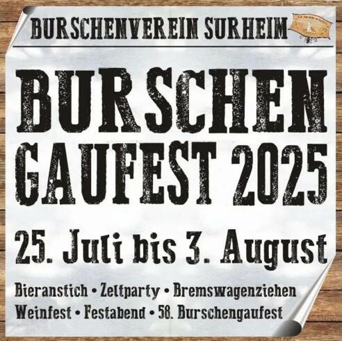120-jähriges Gründungsfest des Surheimer Burschenvereines mit Gaufest von 25.07.-03.08.2025 mit dem Festsonntag als Höhepunkt.