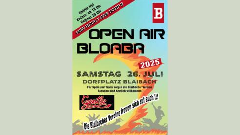 2. Open Air Bloaba 2025 am Dorfplatz in BlaibachDie Blaibacher Vereine freuen sich auf euch und versorgen euch mit Speis und Trank.Eintritt ist frei, Spenden sind herzlich willkommenEinlass ab 18 Uhr Beginn 20 Uhr