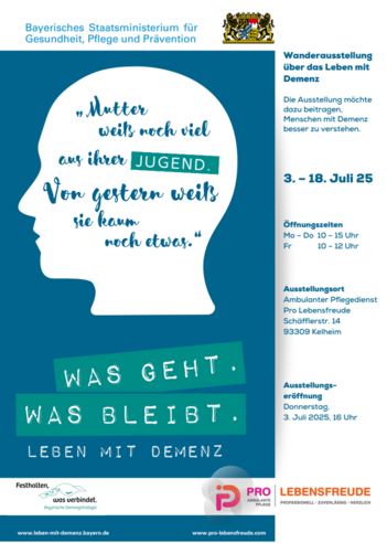Wanderausstellung über das Leben mit Demenz: "Mutter weiß noch viel aus ihrer Jugend, von gestern weiß sie kaum noch etwas ...". Was geht, was bleibt - Leben mit Demenz. Die Ausstellung möchte dazu beitragen, Menschen mit Demenz besser zu verstehen.Ausstellungseröffnung: Donnerstag, 3.Juli 2025 - 16:00 Uhr..
