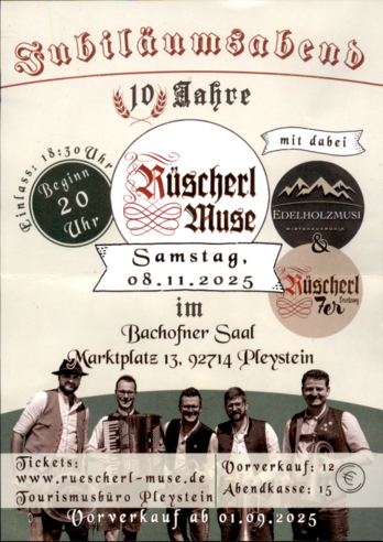 Anl. Jubiläumsabend "10 Jahre Rüscherl Muse" unterhalten "Rüscherl Muse" mit 7er Besetzung und Wirtshausmusik "Edelholzmusi".Einlass um 18:30 UhrKartenvorverkauf unter www.ruescherl-muse.de o. Tourist-Info Pleystein