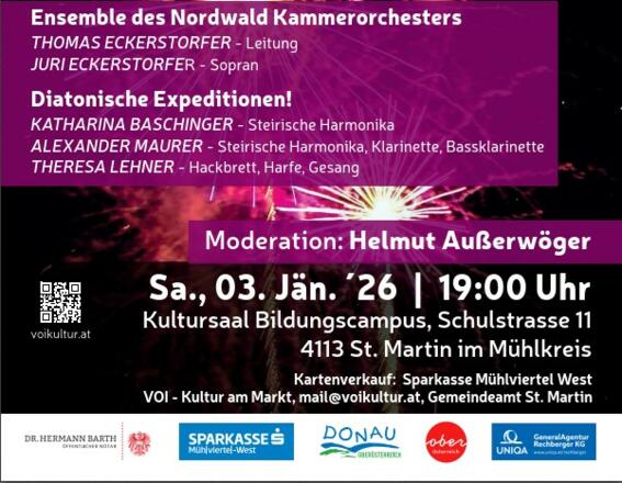Zum bereits fünften Mal lädt das Ensemble des Nordwald Kammerorchesters zu einem festlichen Jahresauftakt. Unter der Leitung von Thomas Eckerstorfer und mit der Sopranistin Juri Eckerstorfer erwartet das Publikum ein abwechslungsreiches Programm voller musikalischer Höhepunkte.