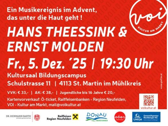 Wenn zwei Ausnahmekünstler wie Hans Theessink und Ernst Molden gemeinsam auf der Bühne stehen, entsteht ein musikalisches Ereignis, das unter die Haut geht. Mit Blues, Liedern voller Tiefe und einer unvergleichlichen Atmosphäre schenken sie ihrem Publikum einen besonderen Abend im Advent – berührend, stimmungsvoll und einzigartig.