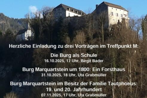 Herzliche Einladung zum Vortrag "Burg Marquartstein im Besitz der Familie Tautphoeus: 19. und 20. Jahrhundert" (Uta Grabmüller). Beginn um 17 Uhr im Treffpunkt M.