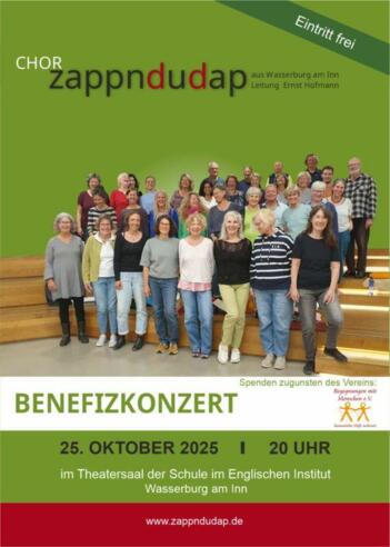 Das Konzert findet am Samstag, den 25.10.2025 um 20 Uhr im Theatersaal der Schule im Englischen Institut in Wasserburg statt. Der Eintritt ist frei, die Spenden gehen an den Verein „Begegnungen mit Menschen e.V.“ .