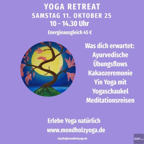 Das nächste Yoga Retreat im Mond-Yoga Raum steht fest. Am Samstag, 11. Oktober um 10 Uhr kannst du dem täglichen Trott entfliehen und die Hektik einmal hinter dich lassen. Von Kopf bis Fuß selbst in dich investieren. Ein energiegeladener Flow am Vormittag auf der Matte, Hatha Yoga am Yogatuch, Meditationen. Nach einer Pause gehen wir es ruhiger an mit Yin Yoga im und am Tuch. Wir runden unseren gemeinsamen Tag mit Meditation und Atempausen ab. Was dich noch erwartet kann sich sehen lassen.