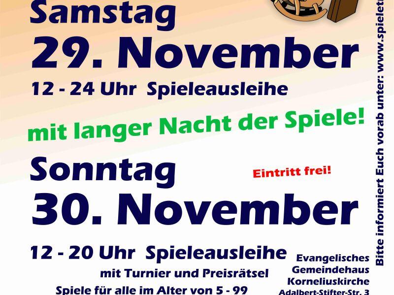 Bis tief in die Nacht kann jede und jeder am Wochenende zum ersten Advent im Gemeindehaus der Korneliuskirche Karlsfeld wieder nach Herzenslust spielen. Dazu hat das Spieleteam des Karlsfelder Spieletreff wieder jede Menge alte und neue Brett- und Gesellschaftsspiele in einer großen Spieleausleihe zurechtgelegt. Hier kann man neue Spiele ausprobieren und vom Spieleteam erklärt bekommen, ohne dass man lange Spieleanleitungen studieren muss. Es ist natürlich auch wieder die Möglichkeit, neue Spiele ausprobieren, die man als Geschenk unter den Weihnachtsbaum legen möchte und dabei sicher gehen will, dass die Beschenkten lange Freude an dem Spiel haben werden.Daneben gibt es noch ein Rätsel und kleine Spieleturniere mit vielen Preisen als Gewinn. Alles in allem eine gute Gelegenheit, ein frohes und erlebnisreiches Adventswochenende zu verbringen.Es lohnt sich allemal, am Samstag, 29. November, von 12.00 bis 24.00 Uhr (mit der langen Nacht der Spiele) und am Sonntag, 30. Dezember, von 12.00 bis 20.00 Uhr im evangelischen Gemeindehaus vorbei zu schauen.Weitere Informationen auf www.spieletreff-karlsfeld.de. Foto: Karlsfelder Kornelius Spiele-Treff
