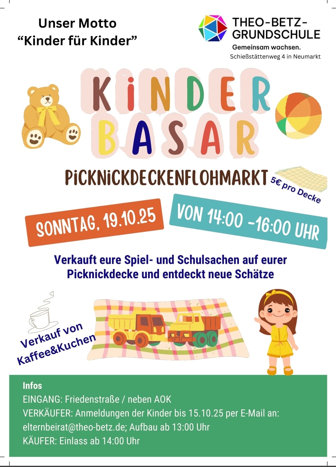 "Kinder für Kinder" - Picknickdeckenflohmarkt von Kindern für Kinder in der Theo-Betz-Grundschule:Verkauft eure Spiel- und Sschulsachen auf einer Picknickdecke und entdeckt neue Schätze.Ein wetterunabhängiger Ausflugstipp für Familien
