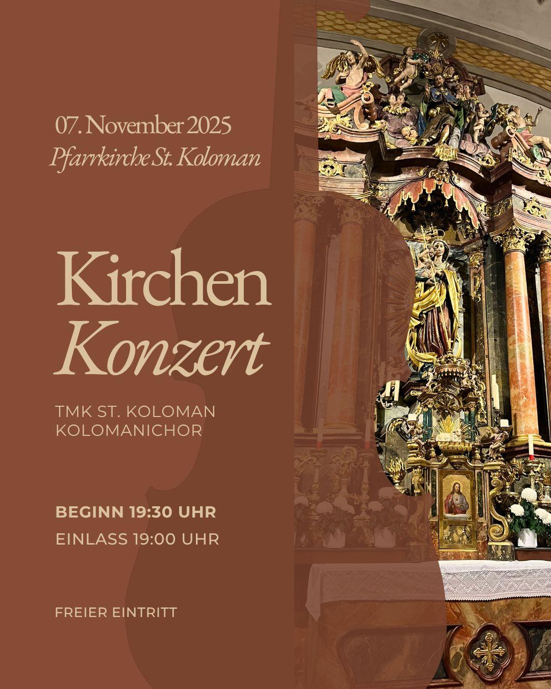 Der Kolomanichor und die Trachtenmusikkapelle St. Koloman laden am Freitag, den 7. November 2025 um 19.30 Uhr recht herzlich zum Kirchenkonzert in der Pfarrkirche St. Koloman ein.
