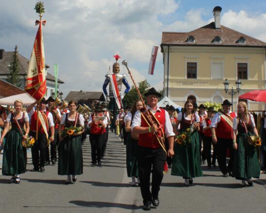Es ist schon ein imposantes Schauspiel, wenn die mächtige Riesenfigur, der Samson, mit seinen beiden Zwergenbegleitern durch die Gassen getragen wird. Der Samson wird von der Trachtenmusikkapelle Mariapfarr begleitet, zu deren Musik er seine Ehrentänze vorführt.