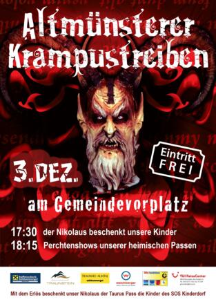 Die Altmünsterer Perchtenvereine wollen das traditionelle Krampusbrauchtum wieder aufleben lassen. Am 03.12. bringt der Nikolaus um 17:30 Uhr – ohne Krampus – Geschenke an die Kinder. Danach, ab 18:15 Uhr, folgen spannende Perchtenshows der einheimischen Vereine mit ihren eindrucksvollen Masken und Kostümen.