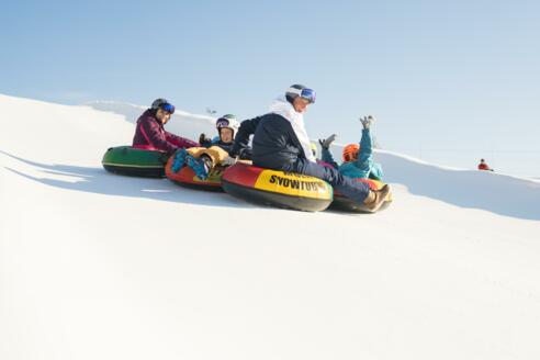 Rutscht verkleidet den Hang hinunter beim Snowtuben – ein riesen Spaß für Groß und Klein!