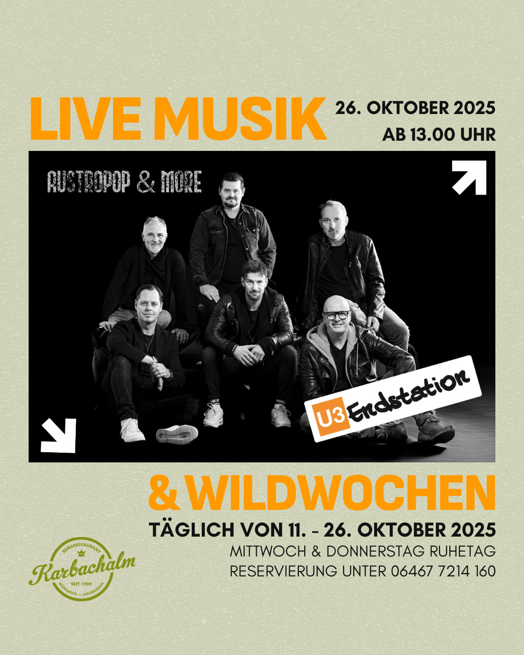 Freut euch auf einen stimmungsvollen Nachmittag mit Live-Austro-Pop, herzhaften Wildspezialitäten und gemütlicher Atmosphäre! Dazu gibt's feinste Austro-Pop-Klänge live gespielt – zum Mitsingen, Mitwippen und Genießen.