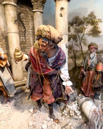 Ein besonderes Highlight sind die Krippenfiguren: Sie stammen aus der Werkstatt der sizilianischen Künstlerin Angela Tripi aus Palermo. Jedes Stück ist ein handgefertigtes Unikat – aus Ton modelliert, gebrannt, bemalt und mit leimgetränkten Stoffen sorgfältig bekleidet.