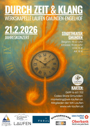 GMUNDEN. Unter dem Motto „Durch Zeit & Klang“ lädt die Werkskapelle Laufen Gmunden‑Engelhof am Samstag, 21. Februar 2026, zu einer musikalischen Zeitreise im Rahmen des traditionellen Jahreskonzerts ein. Eröffnet wird der Konzertabend im Stadttheater Gmunden um 19:43 Uhr vom vereinseigenen Laufenten‑Jugendorchester unter der Leitung von Michaela Gassenbauer. Die jungen Musikerinnen und Musiker zeigen dabei die lebendige Nachwuchsarbeit der Werkskapelle im Laufenten‑Jugendclub.