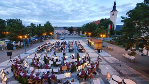 Stimmungsvolles Abendkonzert der Marktmusikkapelle bei sommerlichen Temperaturen auf dem Rathausplatz.