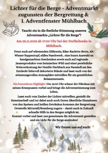 Lichter für die Berge - Adventmarkt zugunsten der Bergrettung & 1. Adventfenster Mühlbach
