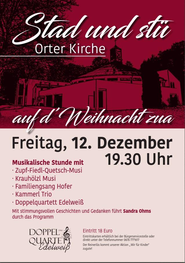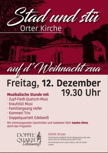 Mit großer Vorfreude dürfen wir unser Adventsingen "Stad und stü auf d´Weihnocht zua" in der Orter Kirche ankündigen. Nähere Informationen folgen!