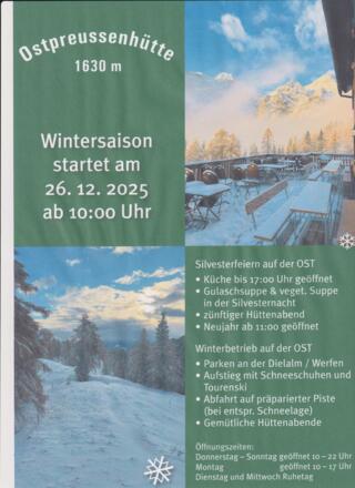 Ab 26. Dezember 2025 hat die Ostpreussenhütte, je nach Schneelage, bis Ende Februar 2026 geöffnet.