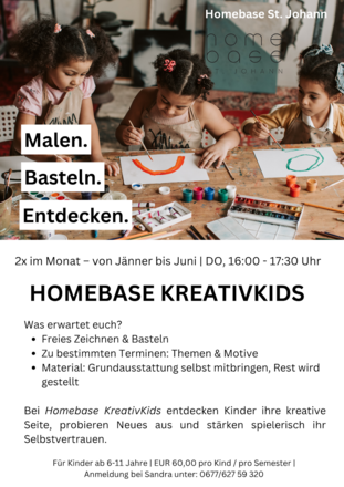 Die Homebase KreativKids bieten Kindern die Möglichkeit, ihrer Fantasie freien Lauf zu lassen, Neues zu entdecken und in einer entspannten Atmosphäre kreativ zu werden – gemeinsam mit Gleichgesinnten.
