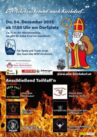 Der Nikolaus kommt am 4. Dezember nach Kirchdorf. Ab 17.00 Uhr gehts am Dorfplatz los, der Nikolaus zieht um 17.30 ein.
