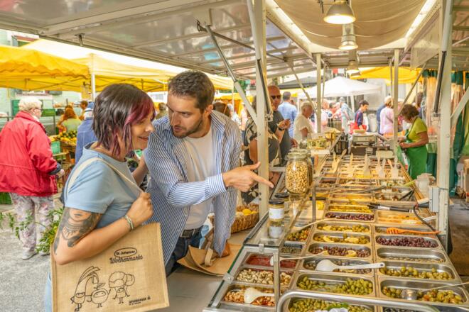 Frisches Obst und knackiges Gemüse, herzhafte Speck- und Käsespezialitäten, knuspriges Brot, wohlriechende Kräuter und Seifen, echter Bienenhonig, feine Antipasti, Geflügelspezialitäten, frischer Fisch und viele andere selbstgemachte Köstlichkeiten aus der Region. Für immer mehr Genießer sind die St. Johanner Würstl, die Germkiachl oder die Brodakrapfen der beste Grund, die Küche kalt zu lassen. Jeden Freitag verwandelt sich der St. Johanner Hauptplatz in einen Tummelplatz für gesellige Menschen aus Nah und Fern und lädt zum perfekten Anfang vom Wochenende! Dann wird nach Herzenslust eingekauft!