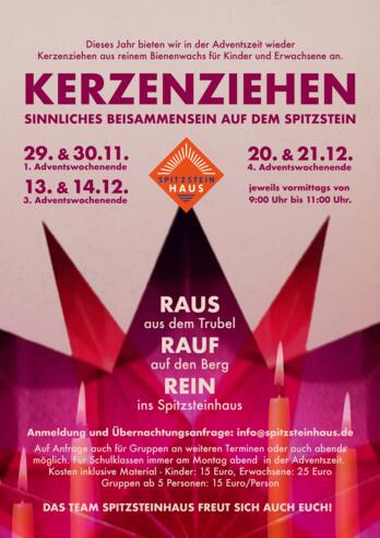 Kerzenziehen aus reinem Bienenwachs >> für Kinder und Erwachsene Raus aus dem Trubel, rauf auf den Berg, rein ins Spitzsteinhaus! Komm zum sinnlichen Beisammensein auf dem Spitzstein. Nimm am Kerzenziehen teil und schließe vielleicht noch eine schöne Winterwanderung und eine Übernachtung an.
