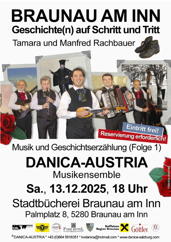 Unter dem Motto „Geschichte(n) auf Schritt und Tritt“ erzählen die Heimatforscher Tamara und Manfred Rachbauer die Geschichten zur Geschichte aus der Stadt am Inn, ergänzt von der inspirierenden Musik des Kulturbotschafters Musikensembles DANICA-AUSTRIA.