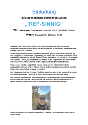 Eine Einladung zu einem TIEF-SINNIG abendlichen poetischen Dialog initiiert und moderiert von Karl Christian Filip, Seelenpoet und Lebenswellenreiter.