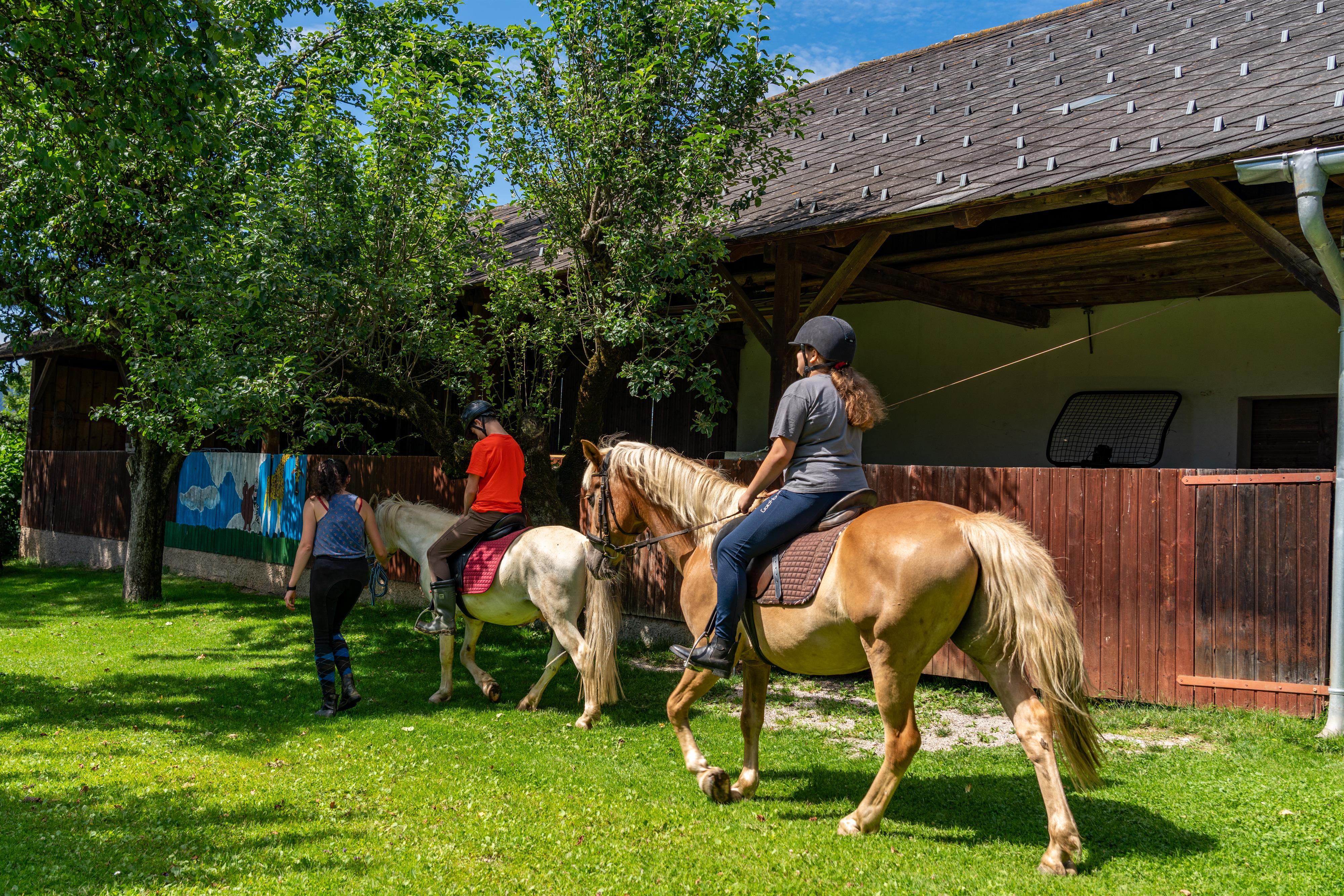 Wir reiten auf einer Geländestrecke am Hof und lernen, wie man sich beim Ausreiten verhält.