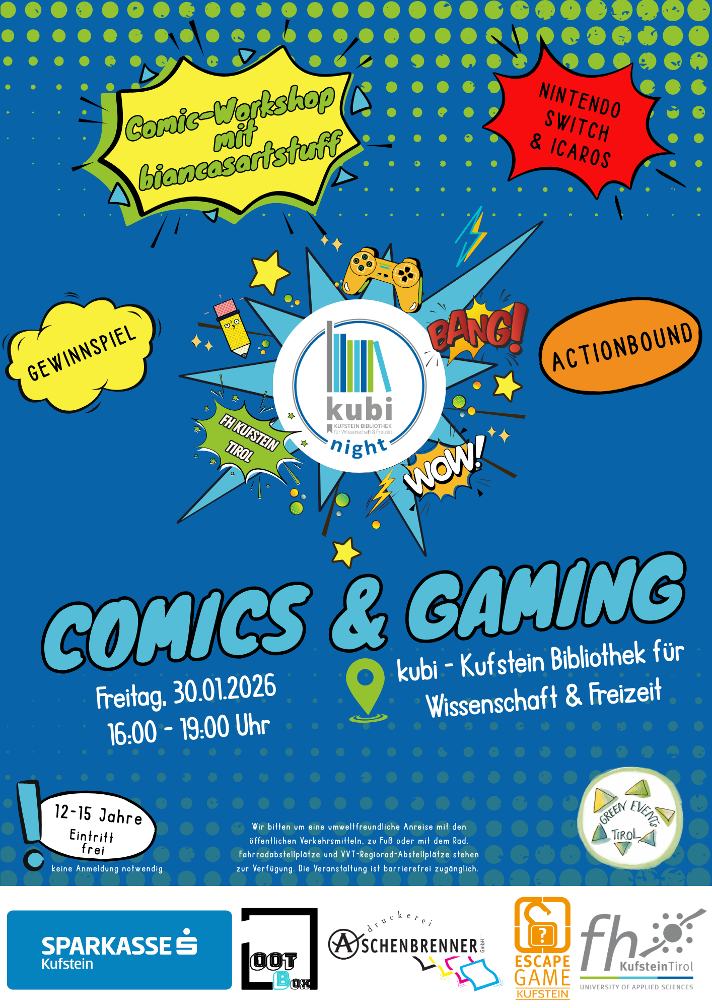 COMICS & GAMING – Interaktives Event für junge Fans an der FH Kufstein Tirol Am Freitag, 30. Jänner 2026, verwandelt sich die kubi – Kufstein Bibliothek für Wissenschaft & Freizeit an der FH Kufstein Tirol von 16:00 bis 19:00 Uhr findet i ein abwechslungsreiches Programm rund um das Thema „Comics & Gaming“ statt.“. Passend zum Thema erwartet Jugendliche im Alter von 12 bis 15 Jahren ein abwechslungsreiches, interaktives Programm – bei freiem Eintritt und ohne Anmeldung. Im Mittelpunkt stehen Gaming-Stationen mit Nintendo Switch und Icaros, ein interaktives Entdecken der kubi mit Actionbound sowie ein kreativer Comic-Workshop mit @biancasartstuff, bei dem die Teilnehmenden eigene Ideen zeichnerisch umsetzen können. „Comics & Gaming“ verbindet Spiel, Kreativität und Medienkompetenz und lädt junge Besucher:innen dazu ein, die kubi auf spielerische Weise neu zu entdecken.