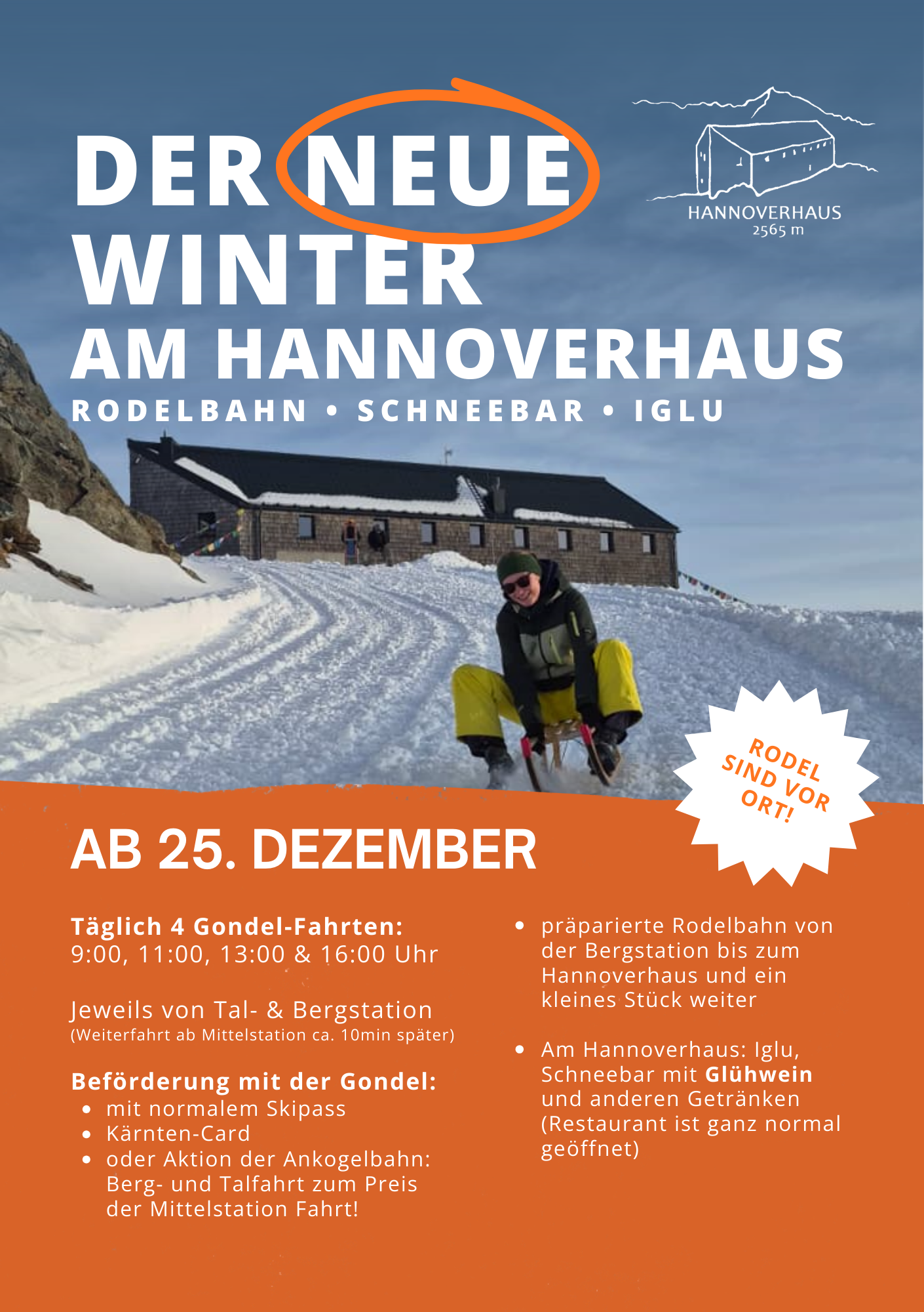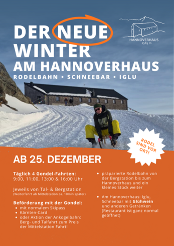präparierte Rodelbahn von der Bergstation bis zum Hannoverhaus und ein kleines Stück weiter, am Hannoverhaus: Iglu, Schneebar mit Glühwein und Getränken, Restaurant geöffnet, Rodeln sind vor Ort verfügbar