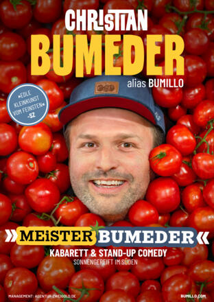 Die Sonne macht den Unterschied! Darum schreibt Christian Bumeder am liebsten im Garten, wo die Luft frisch, der Himmel weit und die Tomaten rot sind. Seine Solo-Shows sind Gewächshäuser voller Gags, Jokes, Samples und Statements, dabei spannt er mit seiner energiegeladenen Stand-up Comedy und seinen wortakrobatischen Liedern die Bögen vom Privaten ins Politische und von Anekdoten aus dem Alltag ins wundersame Weltgeschehen. Apropos: Was ist der Unterschied zwischen seinen Kindern und der Welt? Seine Kinder sind aus dem Gröbsten raus.....