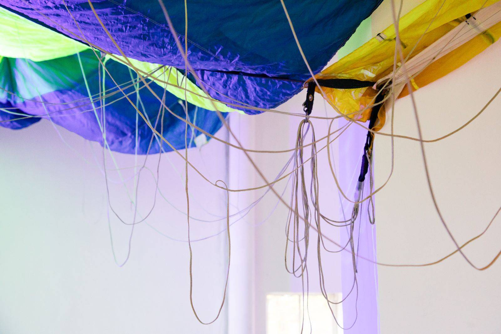 Der zweite Raum öffnet sich als begehbare Installation: Gespannte Fallschirme bilden eine durchlässige Zwischendecke, die Licht sichtbar führt und die Architektur neu definiert. Beim Durchschreiten wird die Gravitation verhandelbar — ein sanftes Spiel aus Stillstand und Schwebe. Die Falte wird zur Schwelle, die Berührung zum Zugang zu einem tieferen Raum.