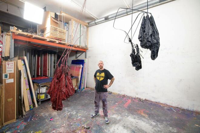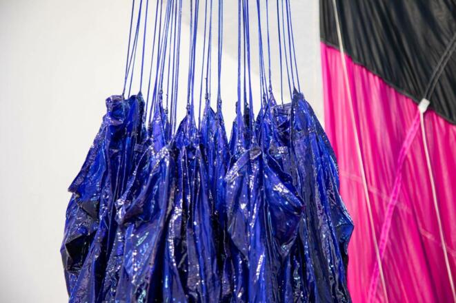 Im ersten Raum hängen Parachute Sculptures von der Decke oder stehen im Raum wie eingefrorene Körper — Fallschirme, deren Fall gestoppt wurde. Ihre Falten sind mit Epoxidharz fixiert, als hätten sie den Moment festgehalten, der sich eigentlich nicht festhalten lässt. Die Parachute Paintings an den Wänden brechen die Grenzen von Malerei und Skulptur auf. Was als leichte Textur erscheint, entpuppt sich als harte, geformte Materie — eine Wahrnehmungstäuschung, die erst im Nahkontakt deutlich wird.