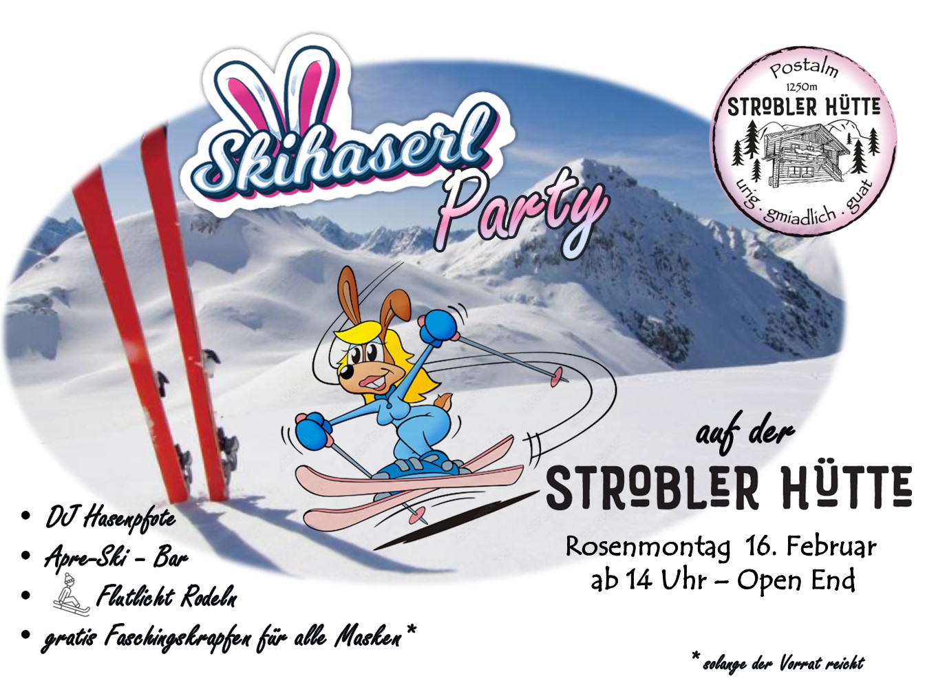 Skihaserlparty auf der Strobler Hütte (Postalm) mit DJ Hasenpfote, Apres-Ski-Bar, Flutlichtrodeln und gratis Faschingskrapfen für alle Maskierten!